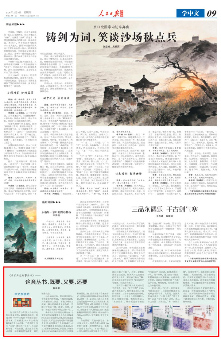 2026年2月5日,《人民日报(海外版)》第09版“中文加油站”栏目刊文《这套丛书,既要、又要、还要》,推荐人民日报出版社出版的《北京历史故事丛书》。