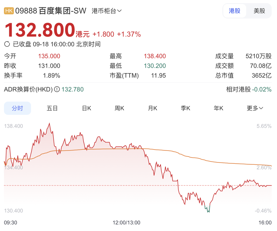 值得一提的是,近日百度(09888.HK)港股股价大爆发,连续多日上涨,9月17日单日暴涨16%,18日继续走高,报收132.8港元,总市值逼近4000亿港元。年初至今,百度港股股价累计上涨超60%。